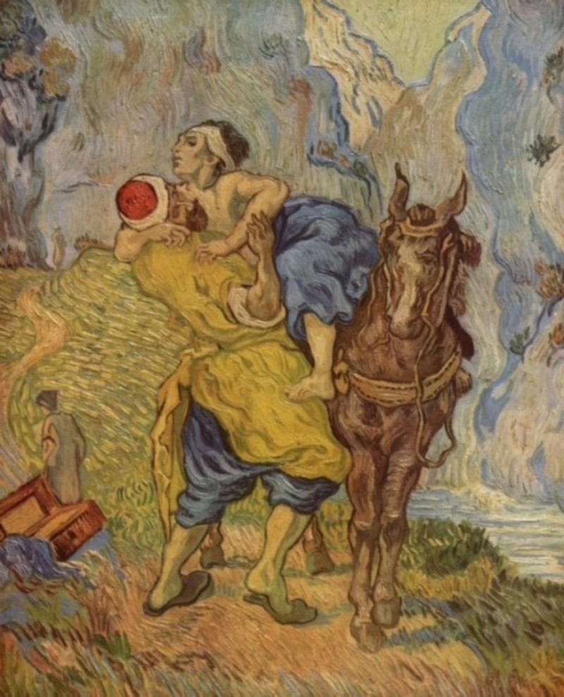 "선한 사마리아인"은 빈센트 반 고흐가 1890년에 그린 작품입니다. 이 작품은 고흐가 프랑스의 오베르쉬르우아즈에 머물고 있을 때 제작한 것으로, 그의 후기 작품 중 하나입니다. 고흐는 종종 성경 이야기나 문학 작품에서 영감을 받아 그림을 그렸으며, "선한 사마리아인"도 그중 하나입니다. 이 작품은 신약성경에 나오는 "선한 사마리아인"의 비유를 주제로 하고 있습니다. 예수가 전한 이 비유에서 한 유대인이 여리고로 내려가는 협곡에서 강도를 만나 죽도록 맞았고 길가에 버려져 다 죽어가는데, 사마리아인이 그를 발견하고 돌봐줍니다. 이 비유는 누가 나의 이웃인가를 질문하였을 때 예수가 비유로 해 준 대답입니다. 우리가 누군가의 이웃이 되려면 진정 선한 사마리아인처럼 자비와 사랑의 삶을 살아야 한다는 내용입니다. 고흐의 그림은 그 비유의 핵심 장면을 시각적으로 표현합니다. 고흐는 여러 버전이 나와 있는 이 장면에 대해 자신만의 스타일로 재해석하며, 강렬한 색채와 역동적인 붓터치를 사용하여 감정적이고 서사적인 작품을 만들어 냈습니다.