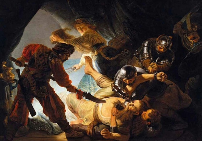 삼손과 들릴라 이야기에서 렘브란트는 이 장면을 삼손이 군인들에 의해 제압당하고 들릴라가 삼손의 머리카락을 전리품처럼 낚아챈 모습으로 그려놓고 있습니다. 들릴라는 은 일천 일백에 삼손을 블레셋 병사들에게 넘겼습니다. 두 눈이 뽑힌 삼손은 하나님으로부터 받은 초인적인 놀라운 그의 힘을 모두 잃어버리고 죽기 직전까지 강제 노동에 시달리며 사람들의 조롱거리가 되었습니다. 그런데 블레셋은 삼손의 머리카락을 계속해서 자르지 않았고 삼손의 머리카락이 자라고 있는 걸 알아차리지 못하고 있었습니다. 삼손이 마지막으로 블레셋 사람과 함께 죽기를 원하노라 하고 힘을 다하여 두 기둥을 껴안고 몸을 굽히자 그 집이 곧 무너져 삼손을 구경하러 왔던 그 안에 있는 모든 블레셋 방백들과 온 백성에게 덮였습니다. 살아 있는 동안 삼손은 맨손으로 사자를 찢었다고 할 만큼 힘이 대단했습니다.