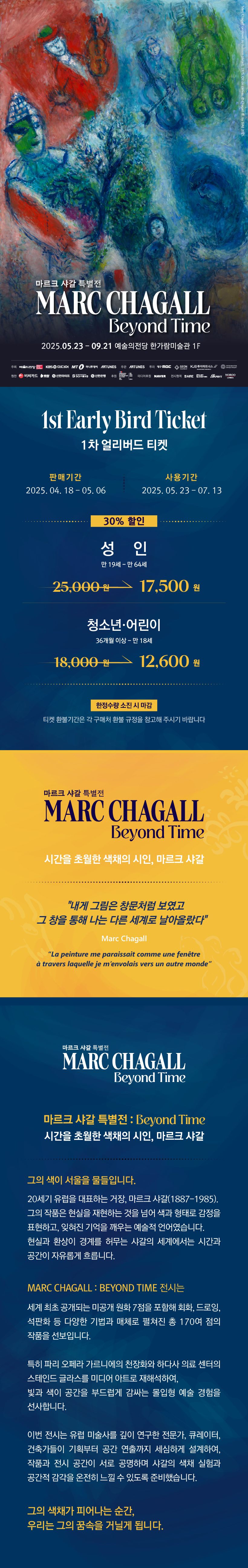 마르크 샤갈 특별전: 비욘드 타임, 시간을 초월한 색채의 시인 샤갈 특별전이 아름다운 5월에 찾아왔습니다. 한가람 미술관 예술의 전당에서 만나보실 수 있습니다.
