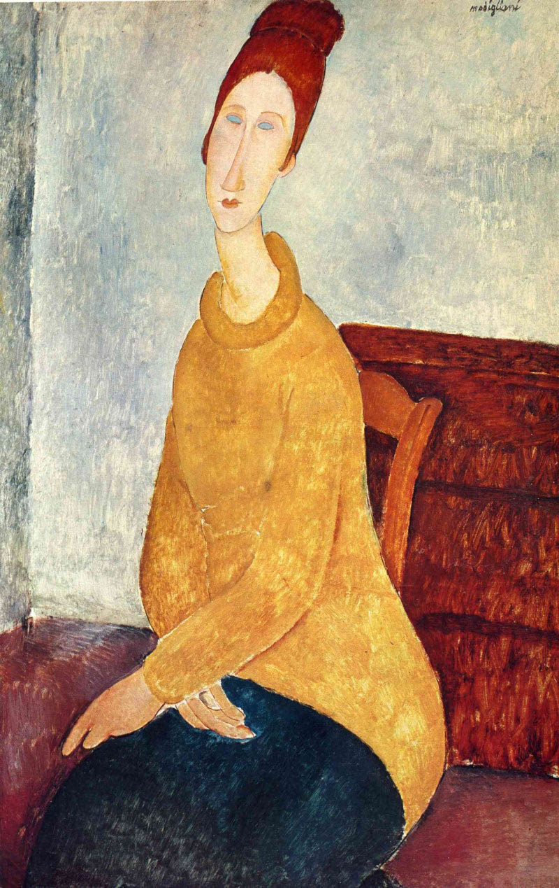 모딜리아니의 작품 중 "노란 스웨터를 입은 여인"(종종 "노란 스웨터를 입은 잔느 에뷔테른"이라고도 함)은 아메데오 모딜리아니의 또 다른 주목할만한 그림으로 그의 뮤즈이자 연인인 잔느 에뷔테른이 등장합니다. 이 그림은 모딜리아니의 독특한 스타일과 잔느에 대한 깊은 애정을 보여주는 대표적인 작품입니다.