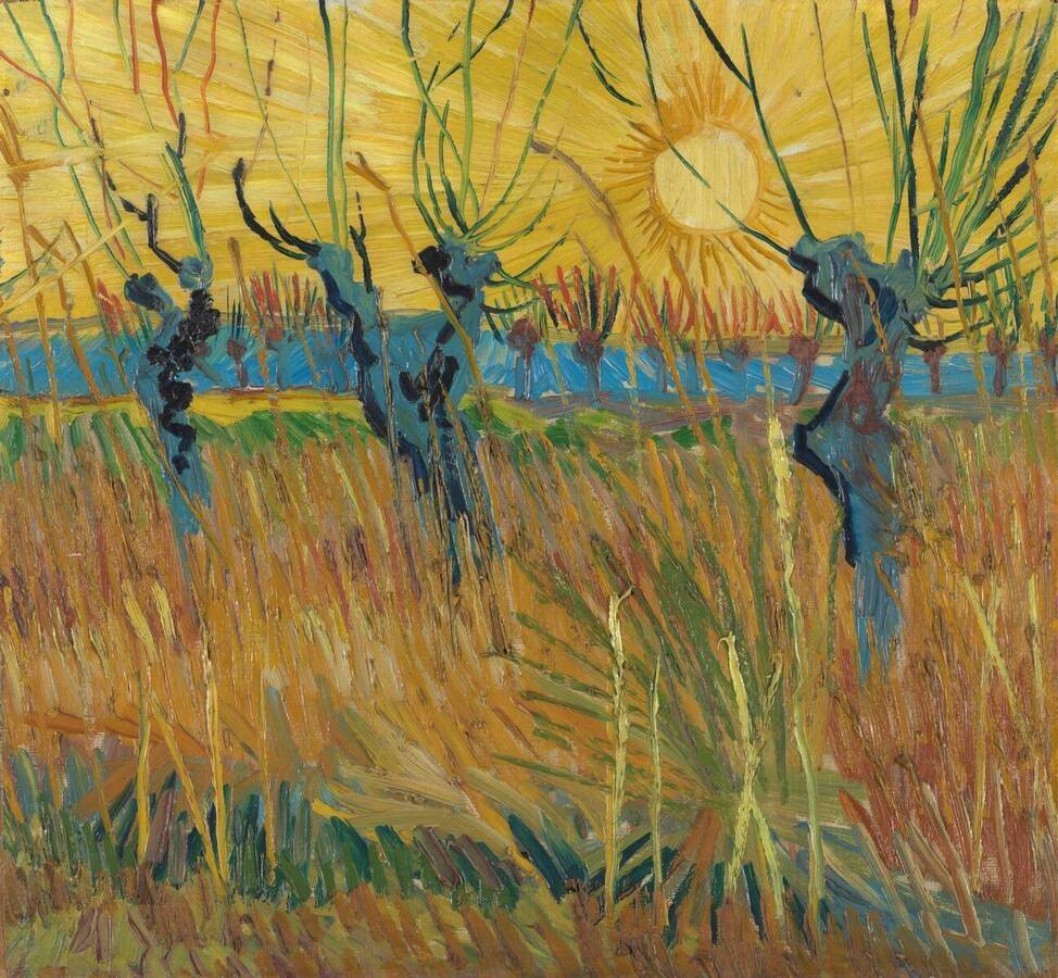 반 고흐는 나무에 새 잎이 돋아나는 3월 해질녘에 폴라드 버드나무를 그립니다. 그는 밝은 노란색, 주황색, 빨간색, 파란색을 사용하여 불규칙한 붓질을 길고 짧게 번갈아 가며 자신감 있게 칠합니다. 폴라드 버드나무 뒤의 선명한 파란색 줄무늬는 아마도 멀리 떨어진 알필레스 산맥을 상징할 것입니다.(크뢸러 뮐러 미술관)