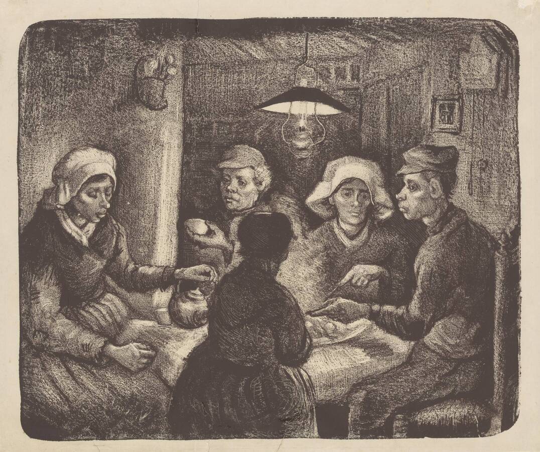 • 유화와 마찬가지로 석판화에서도 농민들이 간단한 식탁에 둘러앉아 감자를 먹는 장면이 묘사됩니다.