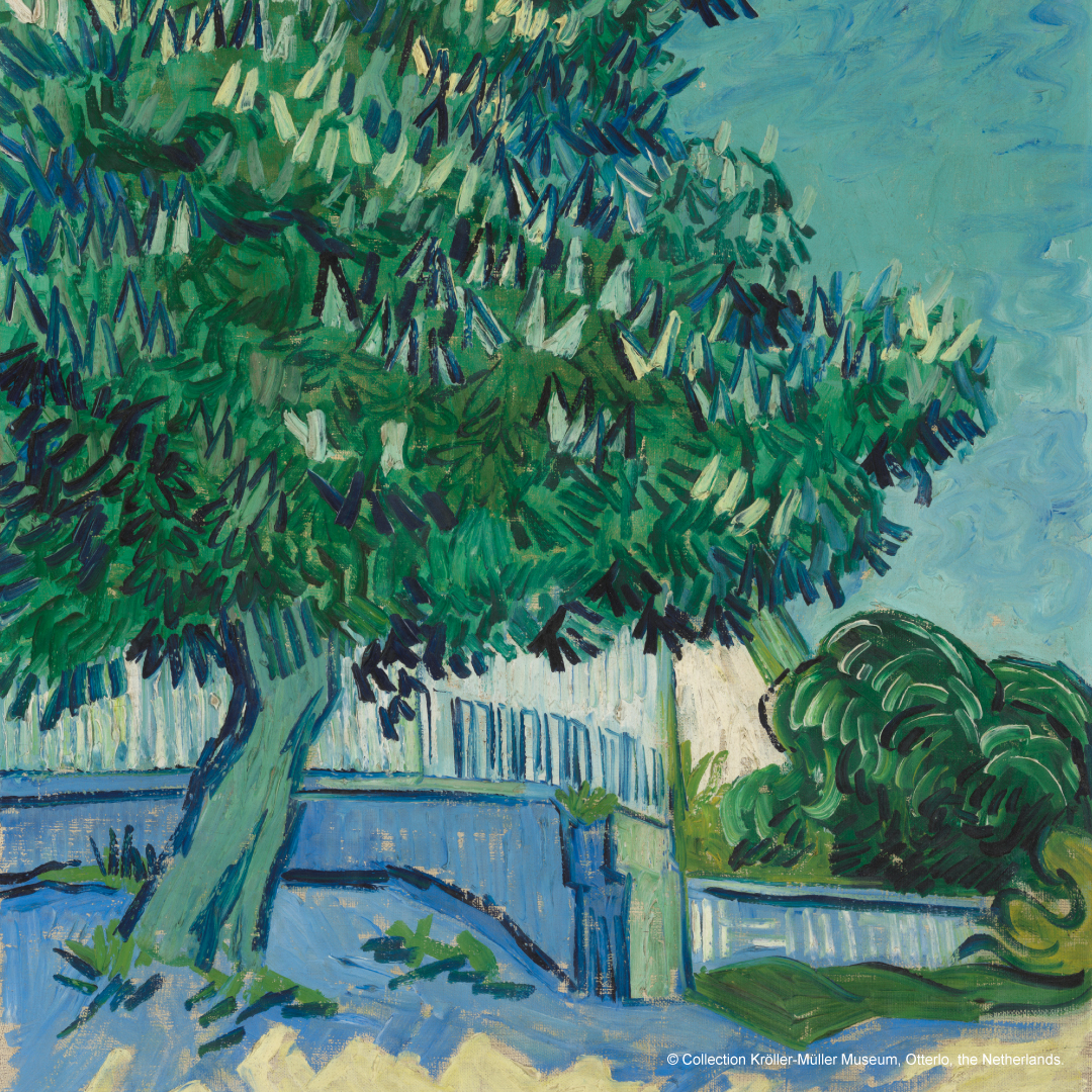 고흐가 1890년 5월에 유화로 그린 꽃이 핀 밤나무 (Chestnut Tree in Blossom)는 고흐가 생레미 정신병원을 떠나 오베르로 이주해 정신적으로 안정된 상태에서 활발하게 작업하던 때 프랑스 북부 오베르쉬르우아즈(Auvers-sur-Oise)에서 작업한 작품 중 하나입니다. 마치 고흐 자신의 내면을 표현하듯이 이 작품은 밝고 활기찬 색채와 함께 나무의 생명력을 표현하며, 고흐가 자연을 대하는 진정성과 감동을 느낄 수 있는 작품입니다. 꽃이 핀 밤나무는 우리의 삶의 가을과 겨울이 지나가고 언젠가 꽃이 피는 봄이 온다는 위로를 주고 있습니다. 초록은 생명의 색인 거 같아요. 언제 보아도 생명력과 생동감이 넘치는 고흐의 꽃이 핀 밤나무는 강인한 생명력을 우리에게 불어 넣어 주고 있습니다. 크뢸러 뮐러 미술관에 소장되어 있으며 예술의 전당 반 고흐 전시회에서 만나 볼 수 있습니다.