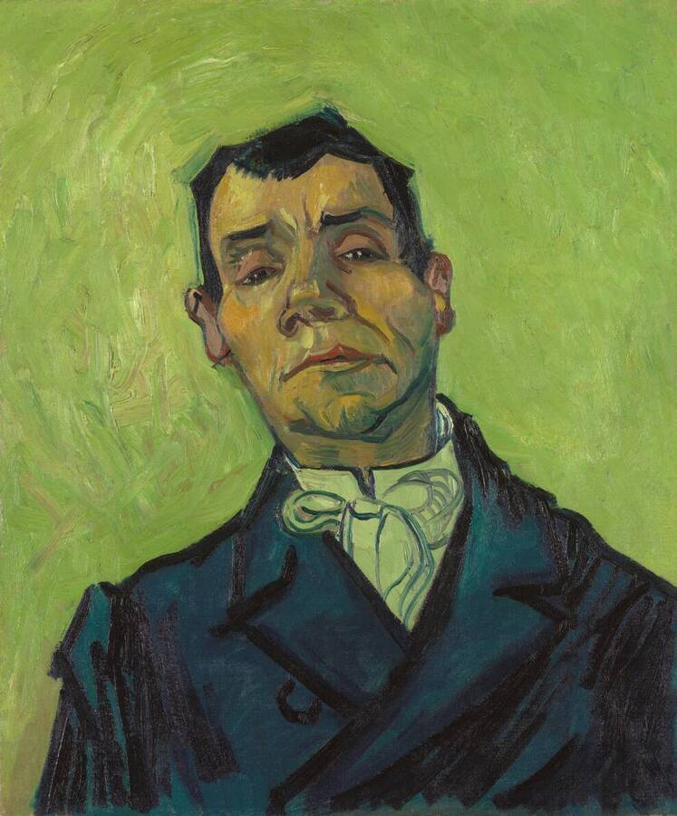 반 고흐의 지누 묘사는 인상적입니다. 반쯤 감은 눈과 날카로운 얼굴 선은 자신감 넘치는 남자를 보여줍니다. 이는 그의 (일요일) 정장과 우아하게 매듭지어진 흰색 넥타이, 화가를 내려다보는 다소 오만한 태도로 더욱 강화됩니다. 그의 머리 주위에는 후광처럼 배경이 그려져 있습니다.