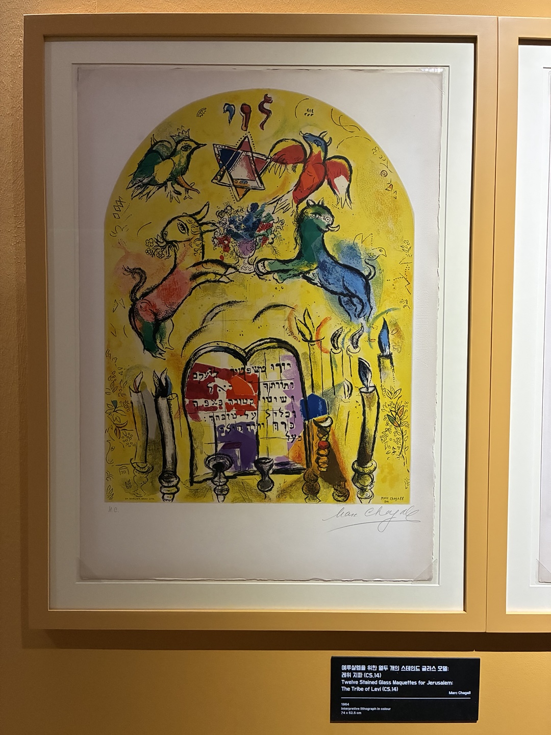 다른 지파와 달리 레위는 땅을 받지 않았습니다. 이는 당시 고대 사회에서 불리한 위치였지만, 영적인 지도자로서 민족의 심장 역할을 맡은 것이라 할 수 있죠. 샤갈은 이러한 **‘소유하지 않음의 거룩함’**을 창의 구조 안에서 잘 드러냅니다.