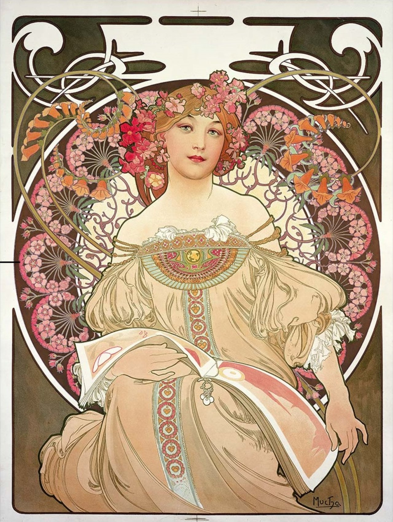 알폰스 무하의 "백일몽"(Daydream)은 1897년에 제작되었으며, 무하의 아르누보 스타일의 대표작입니다. 이 작품은 여성의 아름다움과 자연의 풍요로움이 조화를 이루며, 무하의 독특한 곡선미와 장식적 패턴으로 구성되었습니다. 첫째, 중심 인물로 작품의 중심에는 우아하고 긴 생머리를 가진 젊은 여성이 있습니다. 그녀는 잠에서 덜 깨어나 아직 꿈을 꾸고 있는 듯한 눈빛으로 앞을 바라보며, 한 손으로 책을 받치고 다른 한 손으로 책장을 넘겼습니다. 여성의 얼굴에는 무언가를 깨달은 듯, 어쩌면 꿈에서 무언가를 본 듯 상기된 표정이며 편안함과 지적인 분위기가 느껴집니다. 둘째, 배경으로 여성의 뒤에는 패턴화 된 아름다운 작은 꽃들이 가득합니다. 이 곡선과 패턴은 무하의 작품에서 나타나는 디자인적인 요소들이며 기존의 화가들의 작품에서 찾아보기 힘든 새로운 시도였고 중심에 있는 여성의 아름다움을 페이드 아웃 기법처럼 시각적으로 한층 더 돋보이게 해 줍니다. 셋째, 장식 요소로 무하는 작품의 곳곳에 섬세하고 정교한 장식과 패턴과 문양을 그려 넣어 전체적인 미적 조화를 상승시키는 효과를 줍니다. 이러한 디자인적 요소들은 그의 작품에 세련미와 화려함을 더해 줍니다.