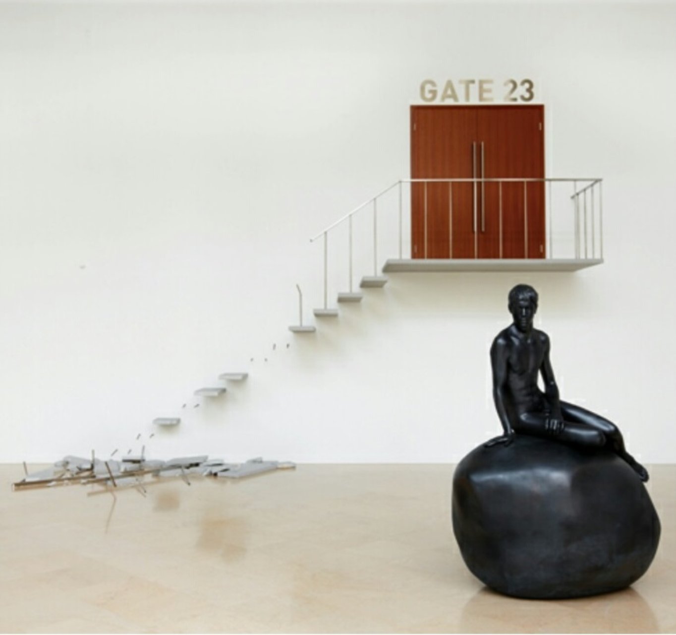엘름그린&드라그셋(Elmgreen&Dragset)의 설치물은 공항을 현대의 자유와 효율성의 기만적 성격에 대한 강력한 은유로 사용합니다. 빠르고 효율적인 여행을 촉진하도록 설계된 공항은 역설적으로 개인의 자유에 심각한 제약을 가합니다. "23번 게이트, 그(검은색)"의 게이트로 이어지는 파괴된 계단은 이러한 환상적 자유를 추구하는 과정에서 직면하게 되는 장애물과 좌절을 상징합니다. 철저한 보안검색과 지연 알림은 이러한 공간을 지배하는 통제와 감시를 상기시키는 역할을 합니다.