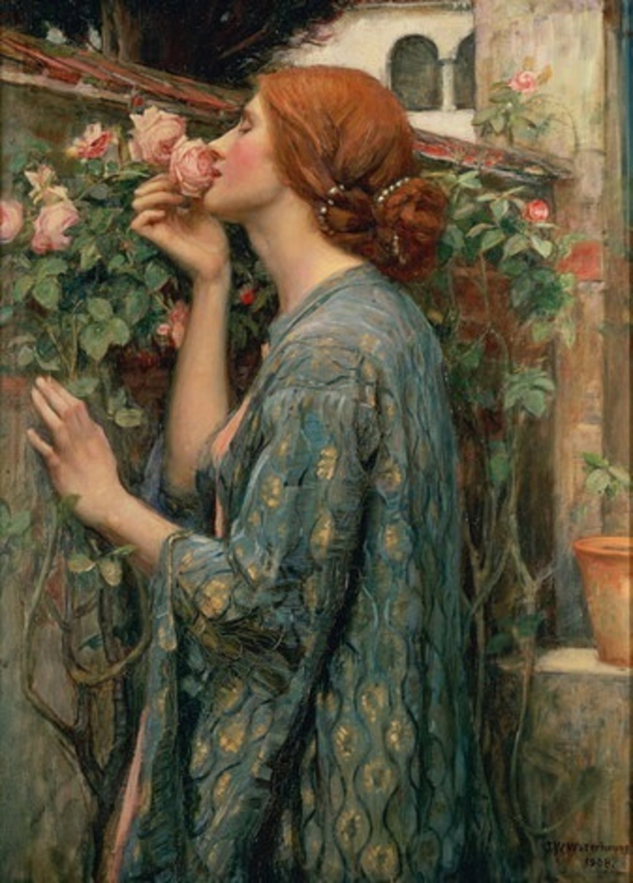 이 작품은 장미 덩굴 앞에 서 있는 여성을 묘사하고 있습니다. 그녀는 한 손으로 장미를 잡고 얼굴을 가까이 대어 향을 맡고 있으며, 그녀의 뺨도 분홍색 장미처럼 붉게 상기되어 있습니다. 벽에 한 손을 기대고 다른 한 손으로 장미꽃을 움켜쥔 채 입 맞추고 있는 이 모습은 장미의 향기에 아주 깊이 취한 듯한 분위기를 자아냅니다. 그녀는 짙은 금발의 긴 머리카락을 진주장식의 머리끈으로 올려 우아함과 고결함을 나타내고 있습니다. 여성 뒤로는 핑크색 장미 덩굴이 무성하게 퍼져 있으며, 이는 작품의 전체적인 분위기를 눈을 감은 여인처럼 로맨틱하고 몽환적으로 만듭니다. 배경의 색조는 장미의 초록색 이파리와 여인의 푸른 드레스가 부드러운 자연의 색감으로, 여성과 서로 잘 어울립니다. 여성은 짙은 블루와 노랑으로 짜인 우아한 드레스를 입고 있으며, 이는 그녀의 우아함과 고귀함을 더욱 강조합니다. 드레스의 세부 묘사는 워터하우스의 정교한 표현력을 보여줍니다. 핑크색 장미의 꽃말은 ‘사랑의 맹세’ ‘ 행복한 사랑’ 성실과 우아함 온화하고 다정함이라고 합니다. 언젠가는 은줄이 풀리고 금 그릇도 깨어지고 항아리가 샘 곁에서 깨지고 바퀴가 우물 위에서 깨지고 흙은 여전히 땅으로 돌아가고 아름다운 핑크색 장미도 시들어버릴 것입니다. 이 아름다운 장미꽃이 시들 기 전 어떻게 해야 이 향기를 지켜낼 수 있을까요?